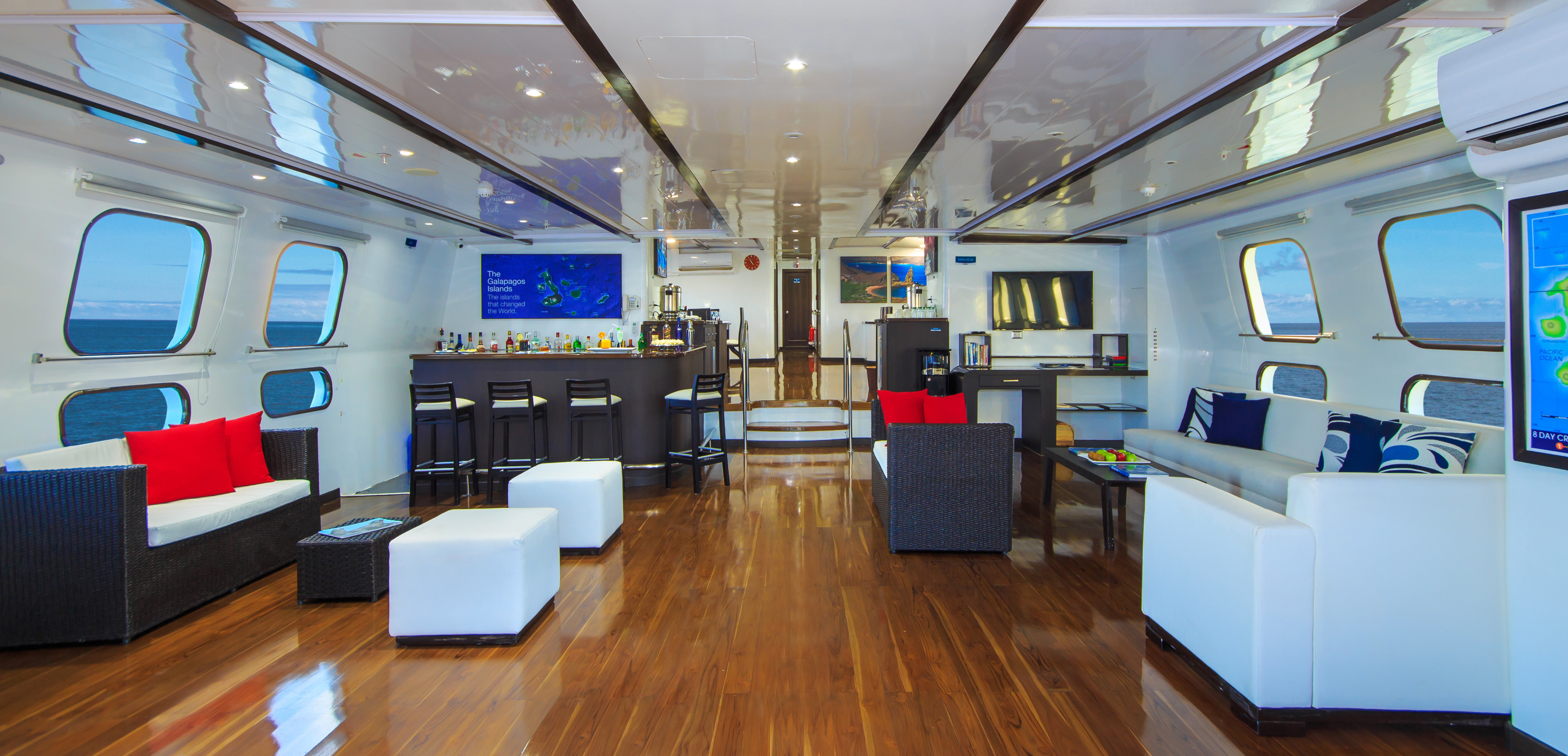 - Take a load off in the spacious lounge area on the main deck. The lounge is beautifully decorated. It’s also a great place to get a drink from the bar and where you will get your daily briefing sessions.